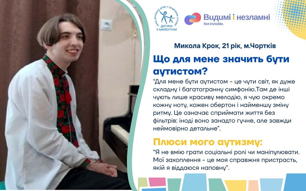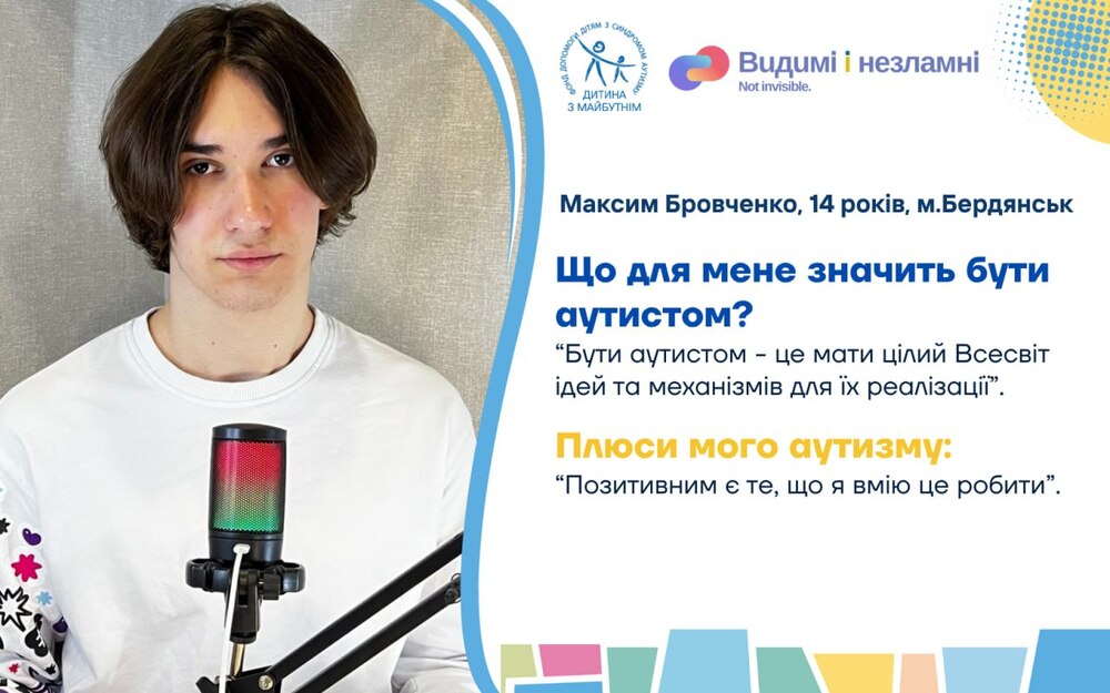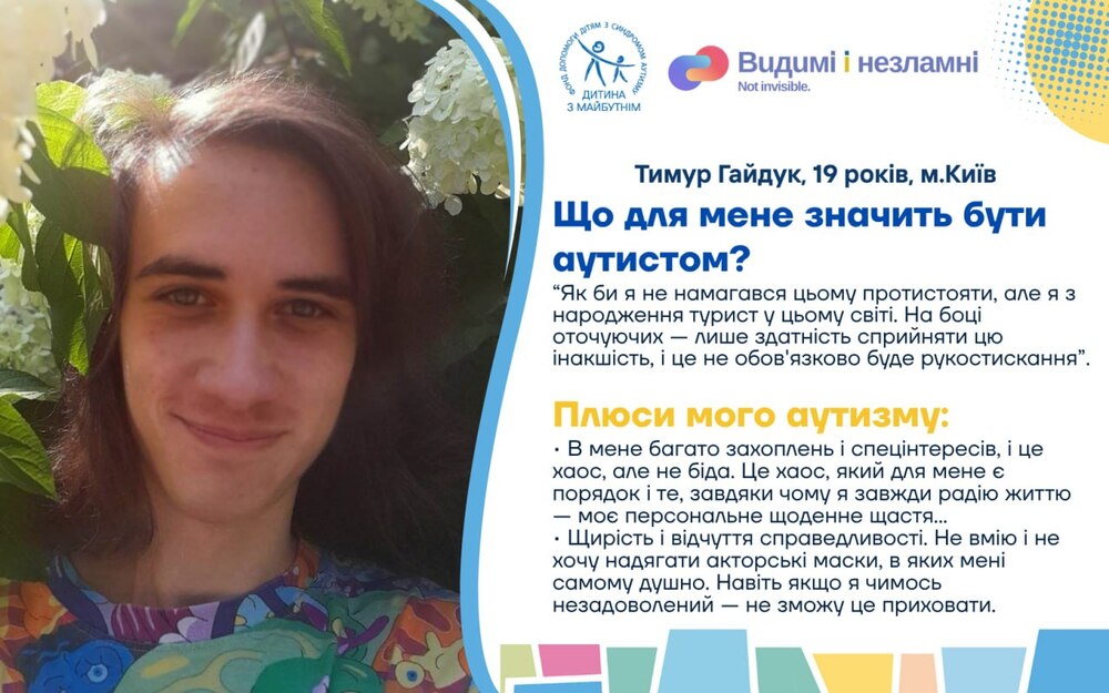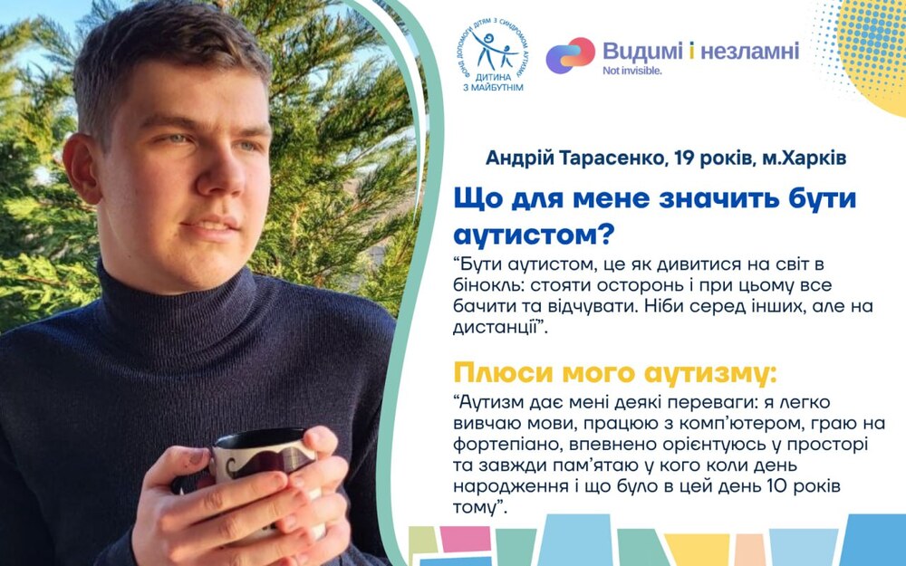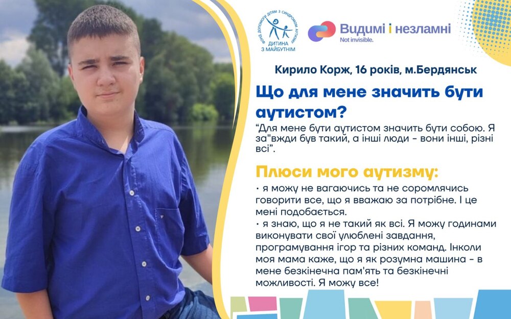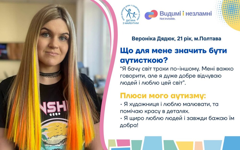 Проєкт «Видимі та незламні. Історії про життя і виклики українських дітей з аутизмом під час війни» покликаний підтримати та згуртувати батьків дітей з аутизмом, демонструючи незламність та рішучість простих людей часом в нелюдських обставинах; дітей з РАС – відчути себе потрібними, прийнятими та зрозумілими, а українське суспільство та світ – гордість за стійкість тих, хто найбільше потребує підтримки, але у воєнний час й сам став опорою для інших. Тож долучайтеся до унікальних історій звичайних українських родин, які виховують дітей з аутизмом з перших вуст!